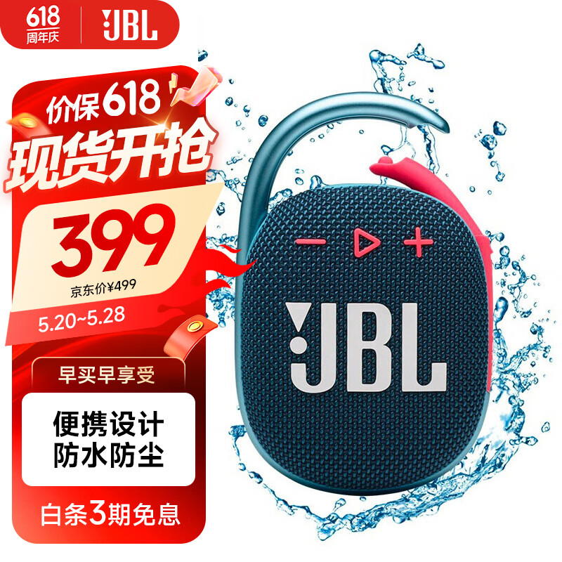 JBL CLIP4 无线音乐盒四代 便携蓝牙音箱 低音炮 迷你小音响 防尘防水 超长续航 520礼物 蓝拼粉价格:399.00元!