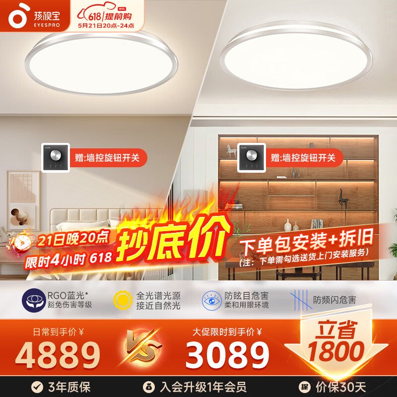 孩视宝【一室一厅套装】全光谱护眼吸顶灯卧室书房客厅灯儿童房灯AH37*2价格:4889.00元!