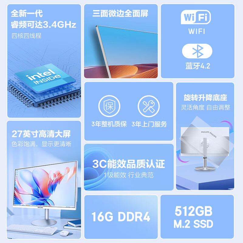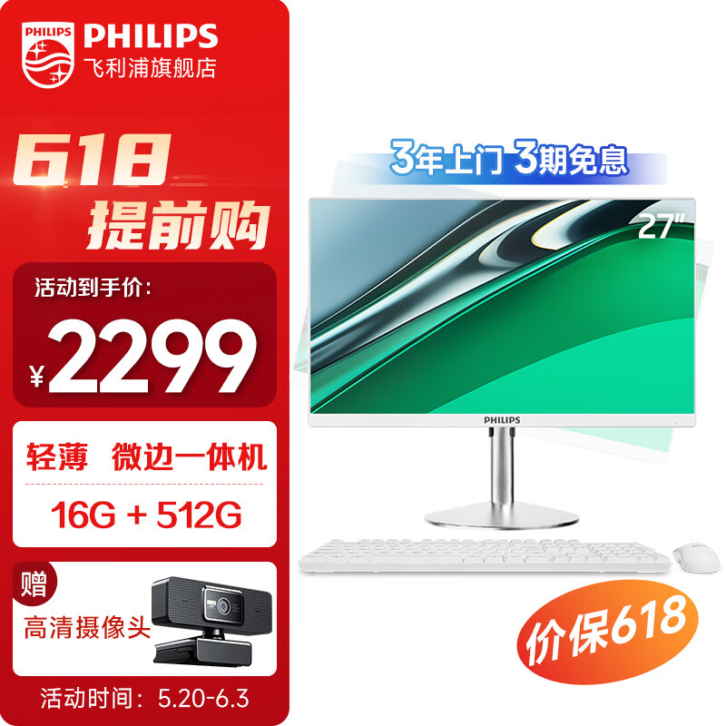 飞利浦S9 27英寸台式一体机电脑 家用学习办公收银主机(12代4核N95 16G 512GSSD WiFi 无线键鼠)白色价格:2299.00元!