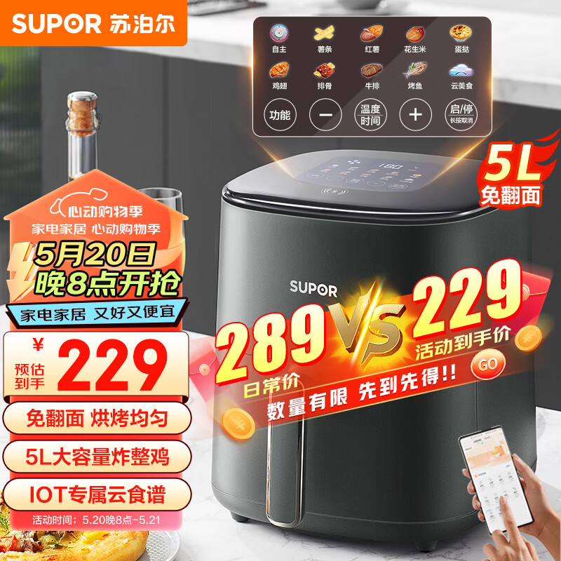 苏泊尔(SUPOR)空气炸锅 家用5L大容量无油低脂煎炸锅精准控温大功率无油烟电炸锅烤箱薯条机KD50D828价格:229.00元!