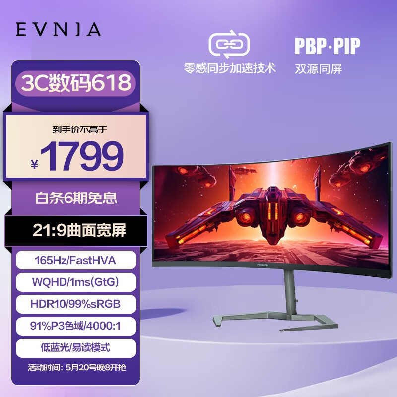 飞利浦 34英寸 曲面带鱼屏准4K WQHD165Hz HVA快速液晶1msHDR 电竞显示器 PS5游戏屏 IF设计奖34M1C5500V价格:1799.00元!
