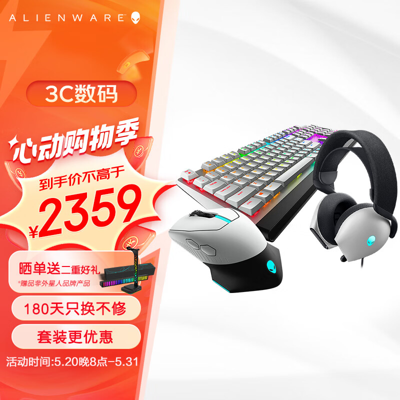 外星人(Alienware)610M+510K+520H 游戏电竞三件套(无线游戏鼠标 有线机械键盘 电竞耳机)RGB高端外设送礼物白色价格:2359.00元!