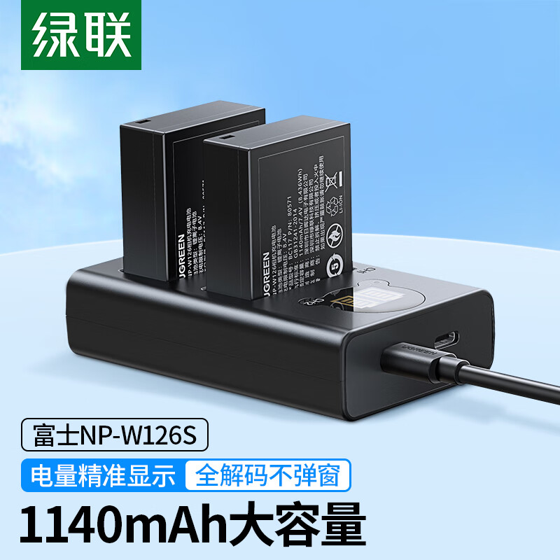 绿联 NP-W126S/W126富士相机电池充电装套装 适用XS10 XT30 XT20 XE4 X100V A5数码相机电池 两电一充价格:149.00元!