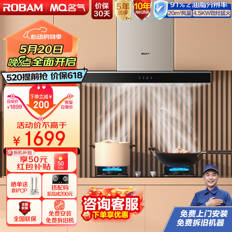 名气(MQ)老板抽油烟机吸油烟机烟灶套装 欧式烟灶套装顶吸 20m3大风量 4.5KW换新灶双灶 6501A+B320A液化气价格:1699.00元!