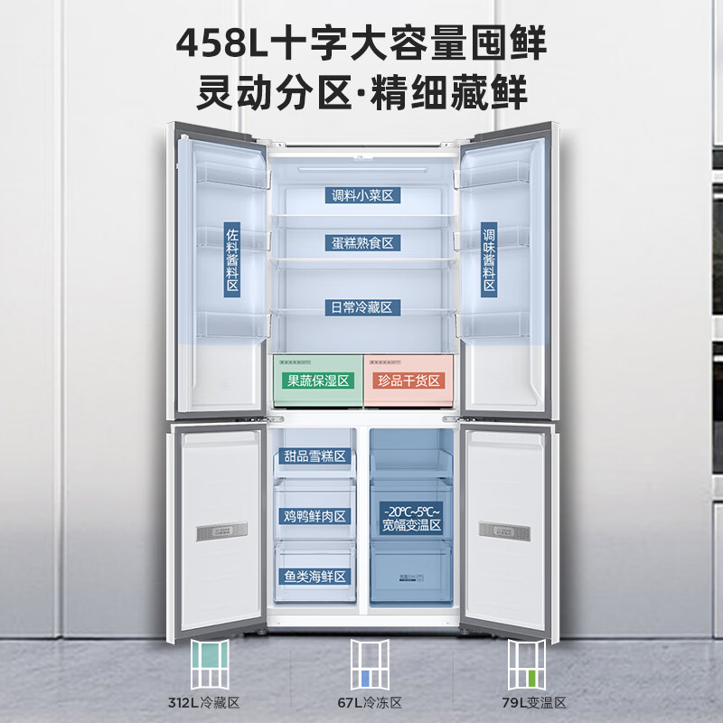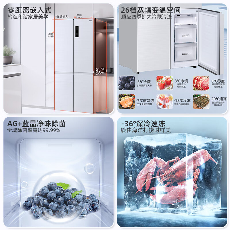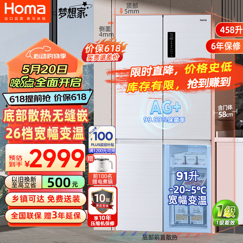 奥马(Homa)60cm以下超薄零嵌入式458升一级能效变频无霜大容量十字双开对开四开门家用电冰箱BCD-458WDK/B价格:3999.00元!