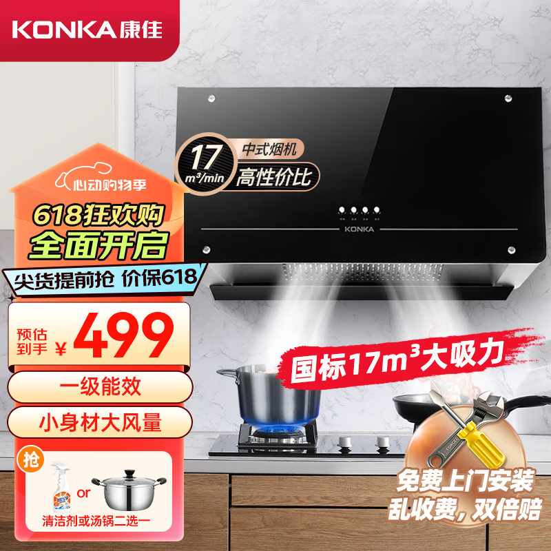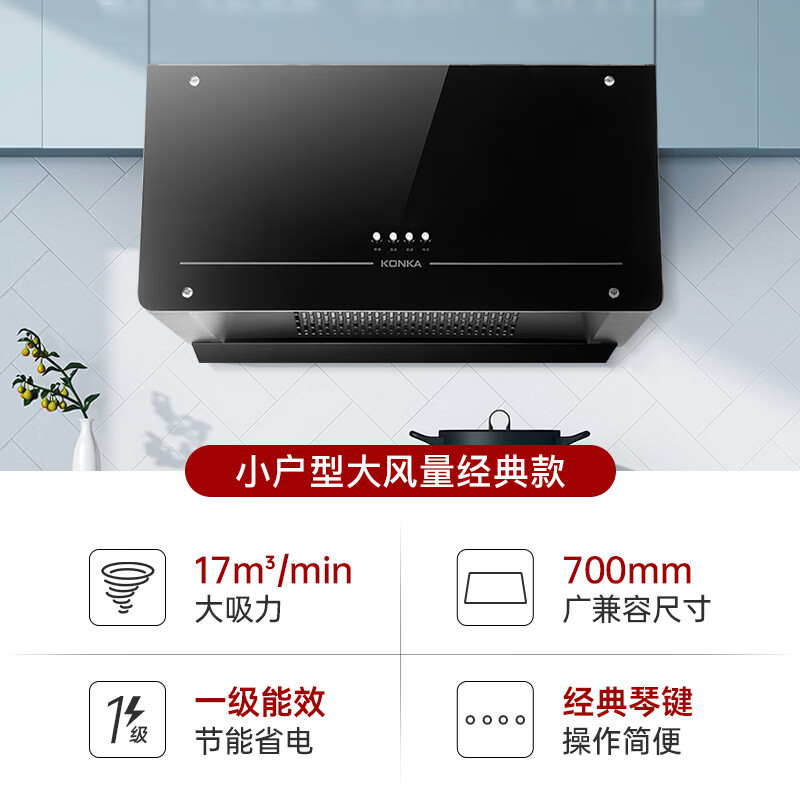 康佳(KONKA)抽油烟机 家用经典款中式吸油烟机 17m3/min大吸力700mm厨房顶吸式脱排烟机 CXW-300-KZ11价格:499.00元!