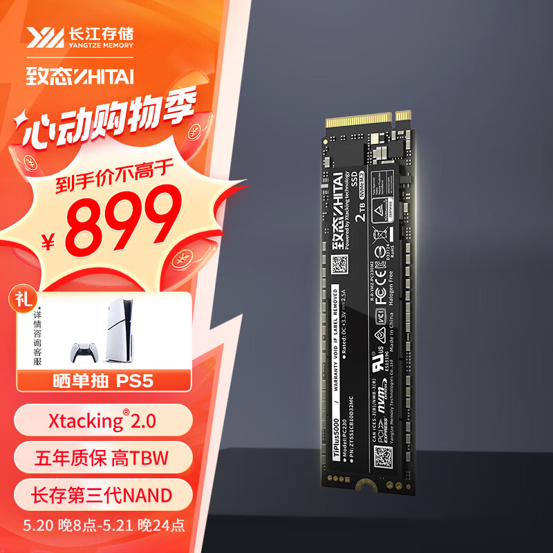 致态(ZhiTai)长江存储 2TB SSD固态硬盘 NVMe M.2接口 TiPlus5000系列价格:899.00元!