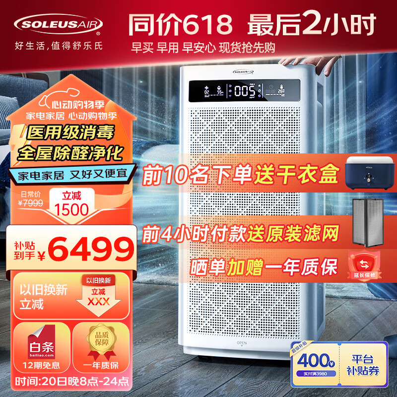 SOLEUSAIR舒乐氏空气净化器除醛除菌宠物吸附猫毛狗毛雾霾异味除花粉过敏原多重污染消毒机 卫健委备案 A10价格:7099.00元!