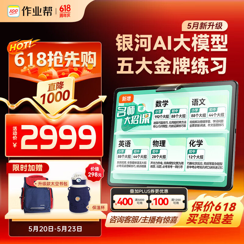 作业帮AI学习机T20Pro+ 学习机平板小学到高中全科作业辅导精准学 赠80万元学习资源 家教机12.7''8+256G价格:2999.00元!
