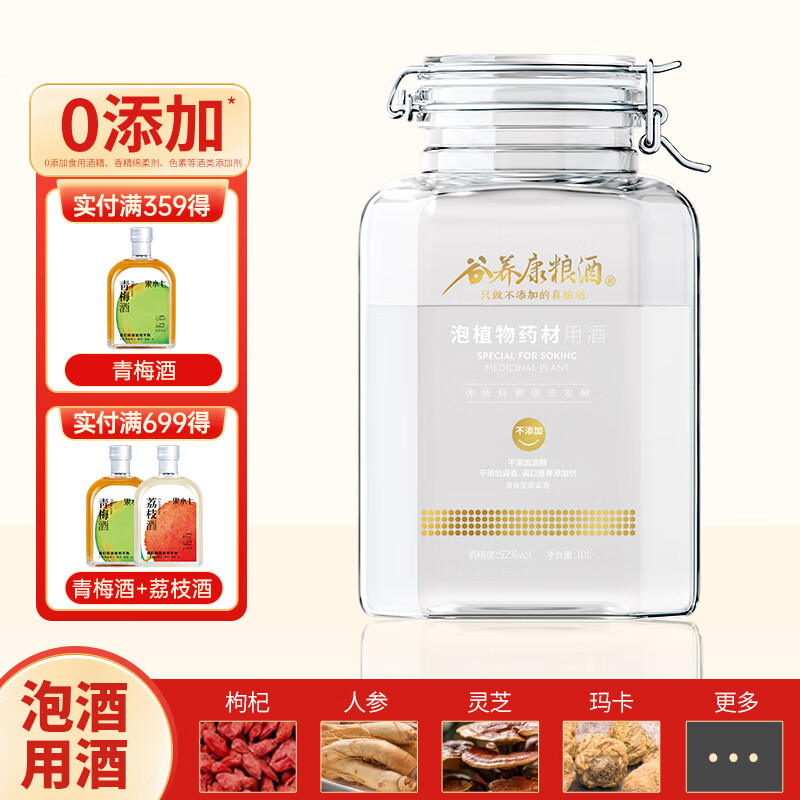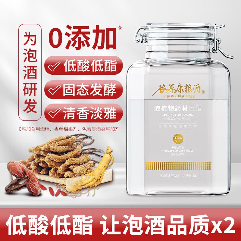 谷养康粮食酒 泡酒用酒大瓶清香高粱酒白酒泡果酒泡药酒水果酒纯粮酒 52度 10L 1瓶 (适合植物类)价格:965.00元!