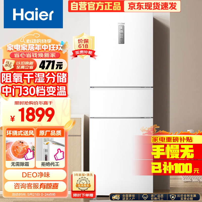 海尔(Haier)255升风冷无霜三开门多门电冰箱小户型家用宿舍出租房一级能效节能中门变温BCD-255WLHC35EWVU1价格:1899.00元!