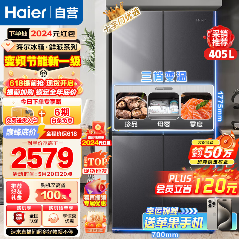 海尔(Haier)冰箱四开门405升一级能效双变频风冷无霜十字双对开门家用超薄大容量WiFi智控三挡变温电冰箱价格:2699.00元!