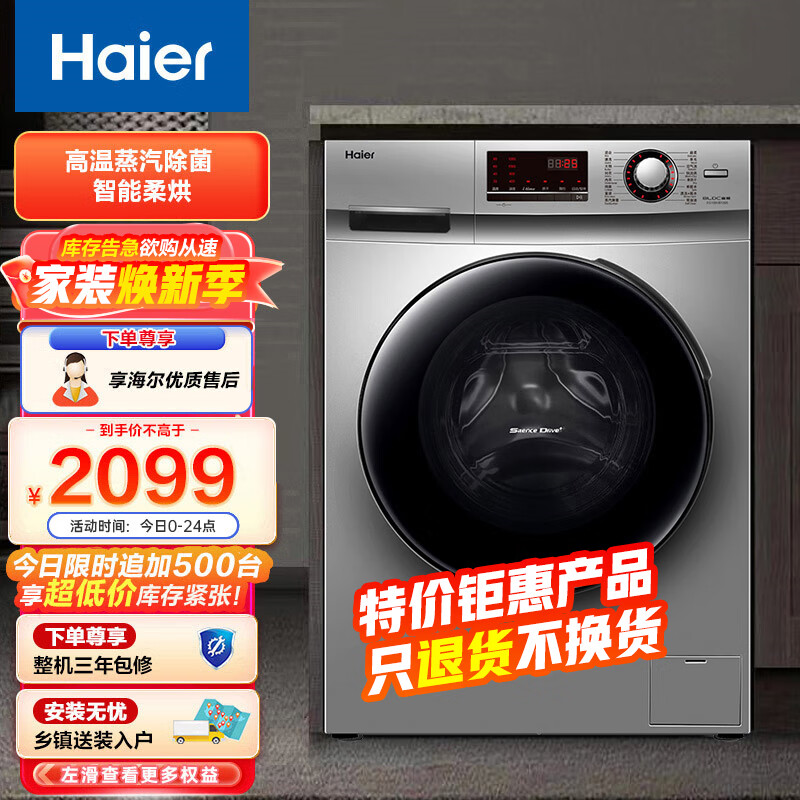 海尔(Haier)滚筒洗衣机全自动 10公斤洗衣机洗烘一体机 健康除菌除螨 蒸汽柔烘 BLDC变频电机 EG100HB129S价格:2078.00元!