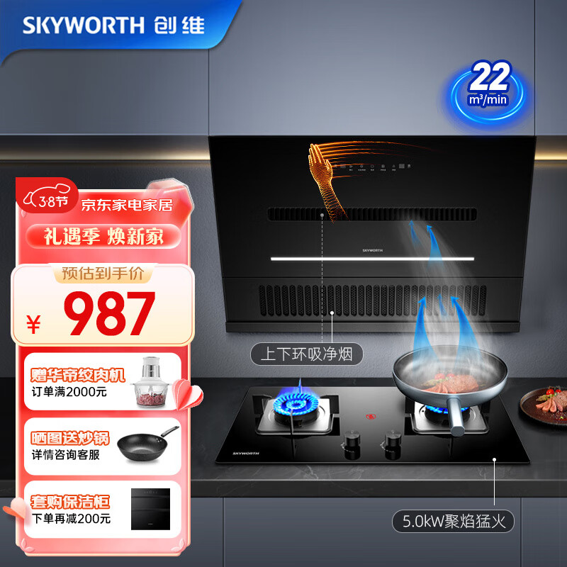 创维(Skyworth)油烟机 顶侧双吸烟灶套装 家用抽油烟机22风量自动清洗油烟机燃气灶具套装 Y3J+Z50BS-1?液化气价格:987.00元!