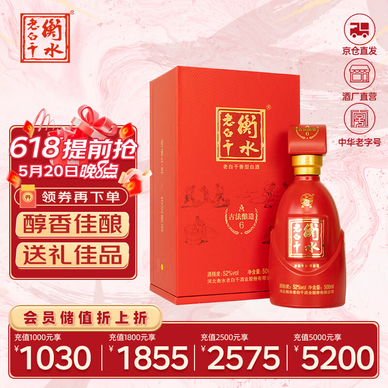 衡水老白干古法酿造A6 老白干香型白酒 52度 500ml单瓶装 婚宴送礼价格:199.00元!