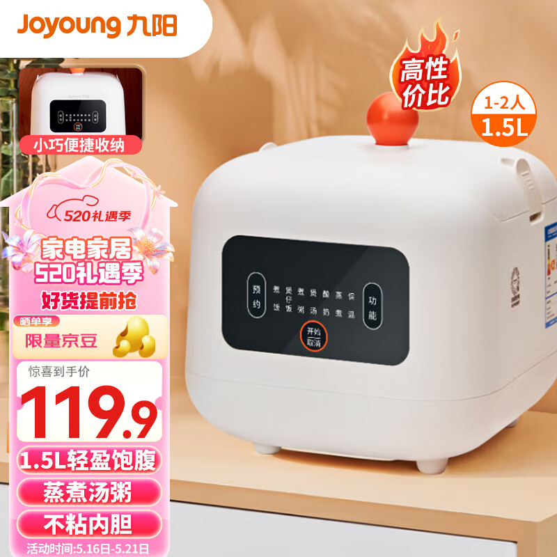 九阳(Joyoung)小型饭煲1.5升迷你智能电饭煲电饭锅简单操控面板黑晶不粘内胆多功能蒸煮煲汤 F121(推荐1-2人)价格:119.90元!