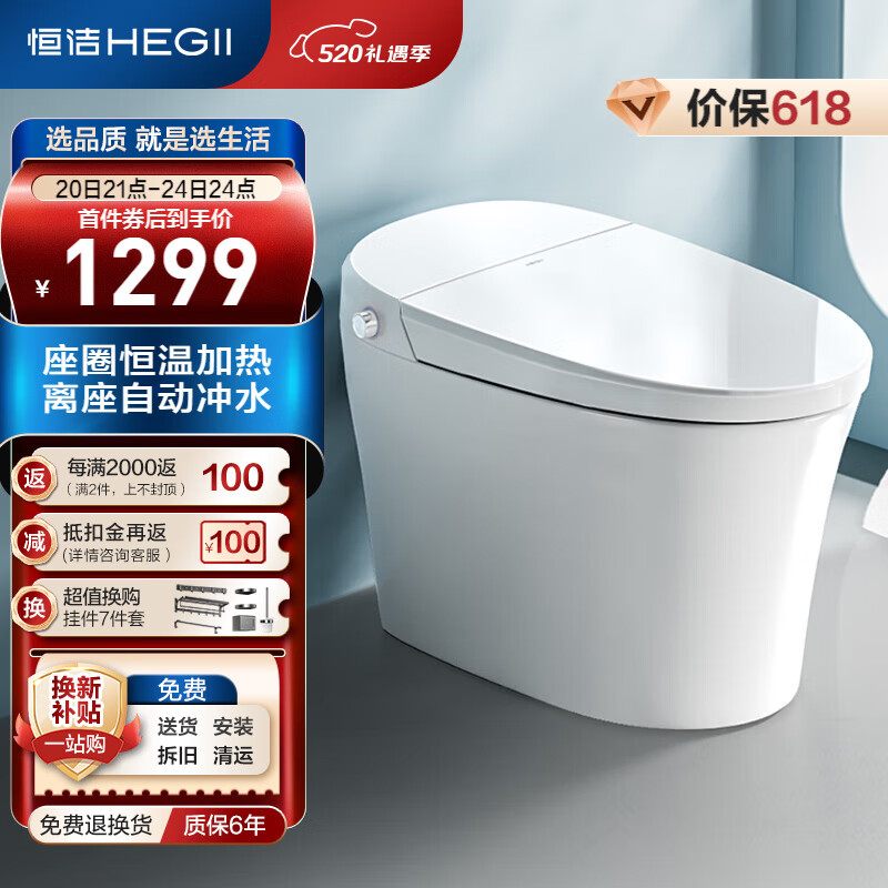 恒洁(HEGII)智能马桶一体机HQ562 虹吸式座圈加热轻智能马桶HC0978A-305价格:1559.00元!