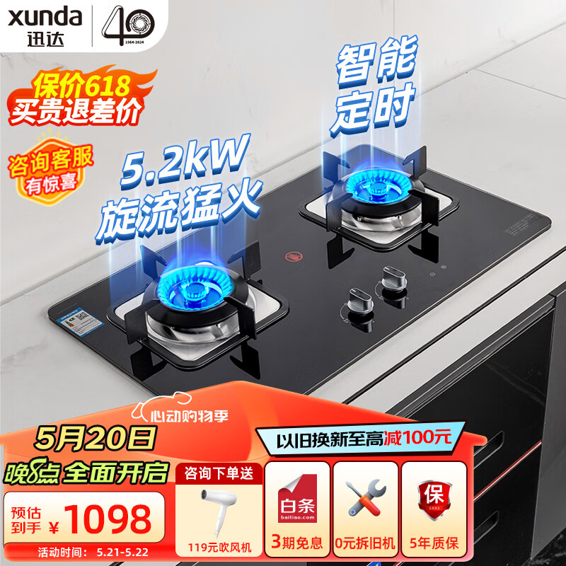 迅达(XUNDA)燃气灶天然气灶家用 双灶具灶台 嵌入式台式两用 5.2KW旋流猛火灶 定时可拆卸炉头 F3-天然气价格:1298.00元!
