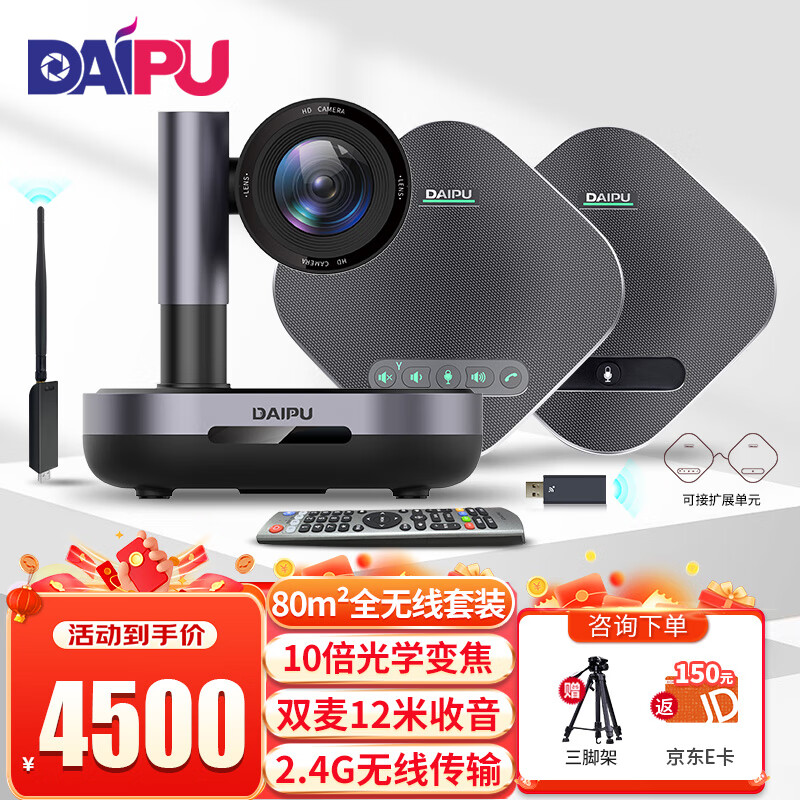 戴浦(DAIPU)大型视频会议室套装T75 适用60-80㎡(10倍变焦会议摄像头+2.4无线会议全向麦克风一拖二级联)价格:4500.00元!