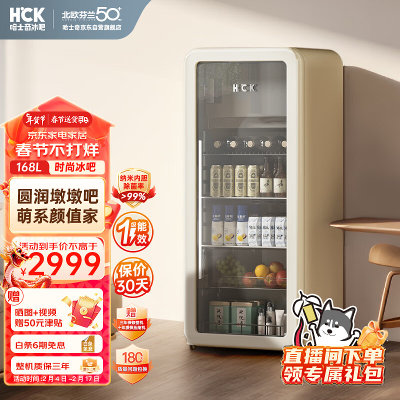 哈士奇客厅冰箱家用复古冷藏冷冻保鲜柜冰吧恒温立式酒饮节能展示柜墩墩吧168升SC-168RD-S 奶茶色价格:2999.00元!