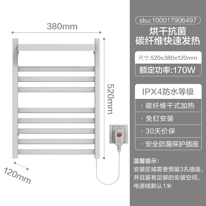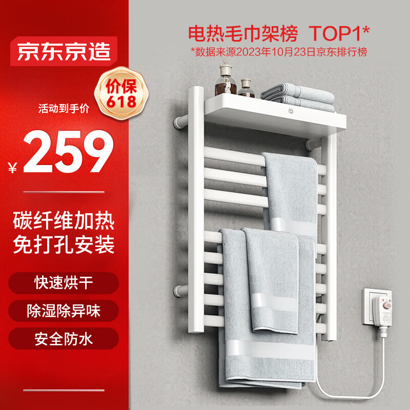 京东京造暖云SE免打孔电热毛巾架 碳纤维加热 卫生间烘干架置物架 瓷光白价格:259.00元!