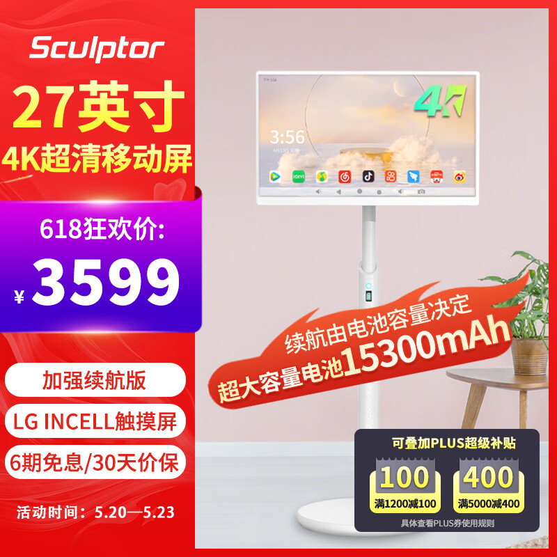 雕塑家 4K移动随心屏 闺蜜机大电池长续航 智慧屏27英寸IPS移动屏 触摸屏幕平板电视安卓系统显示器价格:3649.00元!