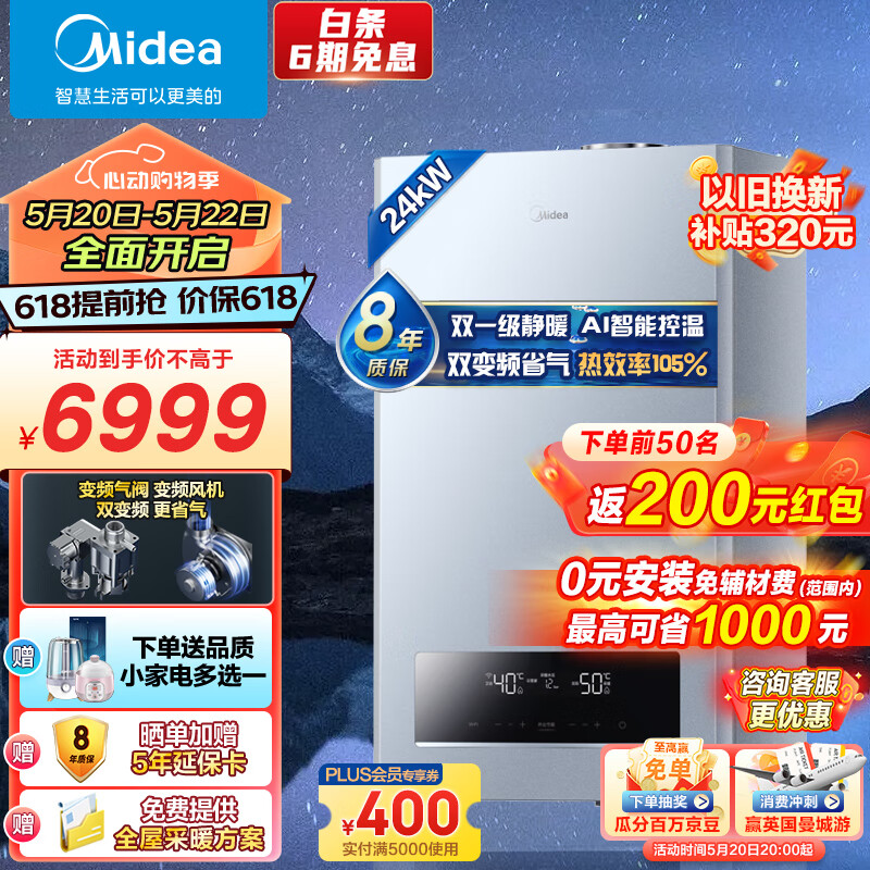 美的(Midea)双变频省气 一级能效 低噪冷凝式燃气壁挂炉 天然气供暖 家用地暖采暖锅炉 免辅材费LL1PBD24-R53价格:7799.00元!