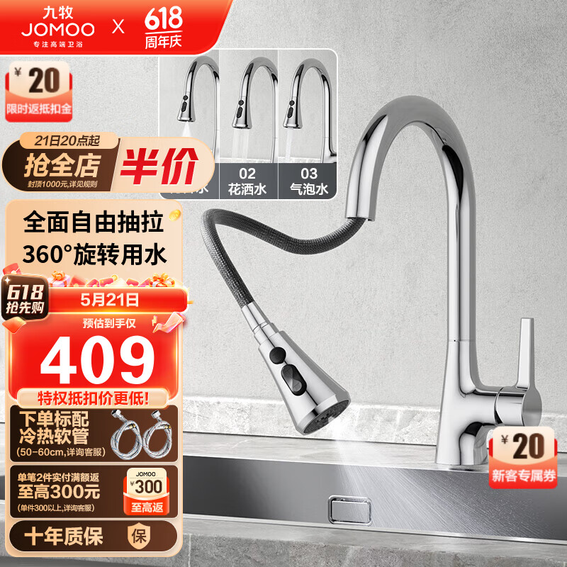 九牧(JOMOO)厨房水龙头冷热三出水抽拉 旋转增压刀片水 33167-594/1B-Z价格:459.00元!