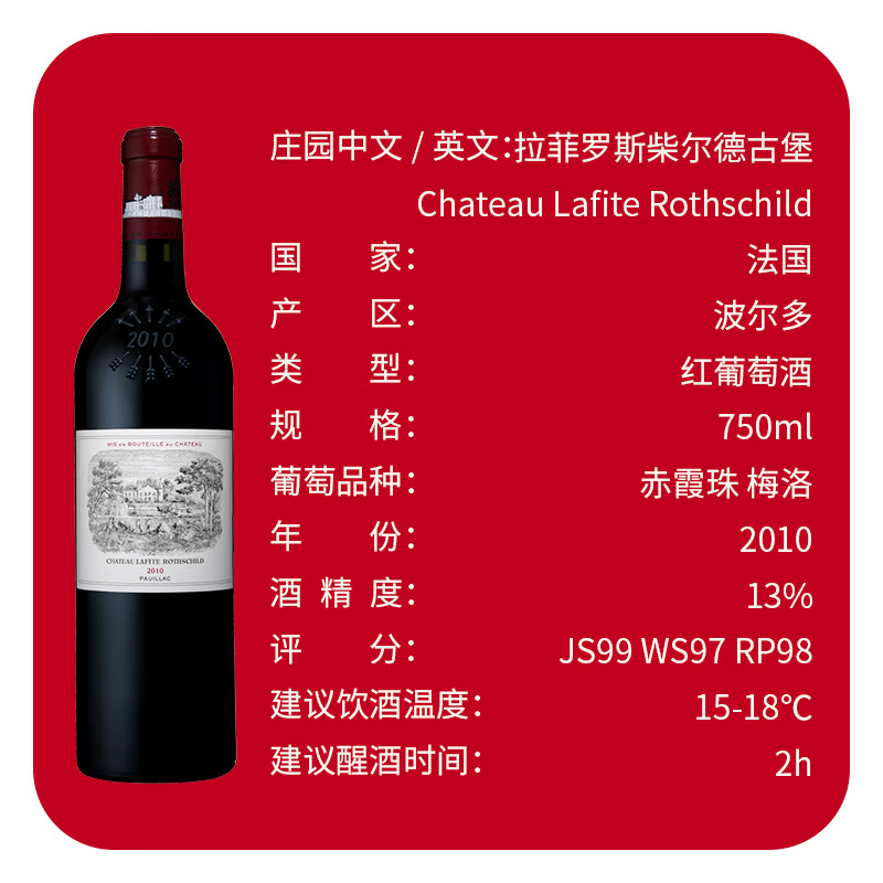 拉菲(LAFITE)大拉菲/ 拉菲古堡干红 2010年 WA 98 分【法国1855名庄】价格:9999.00元!