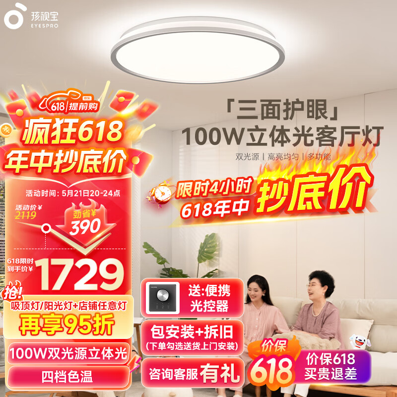 孩视宝客厅大灯护眼吸顶灯卧室书房儿童房防蓝光100W全光谱灯具AH37A-T价格:2119.00元!
