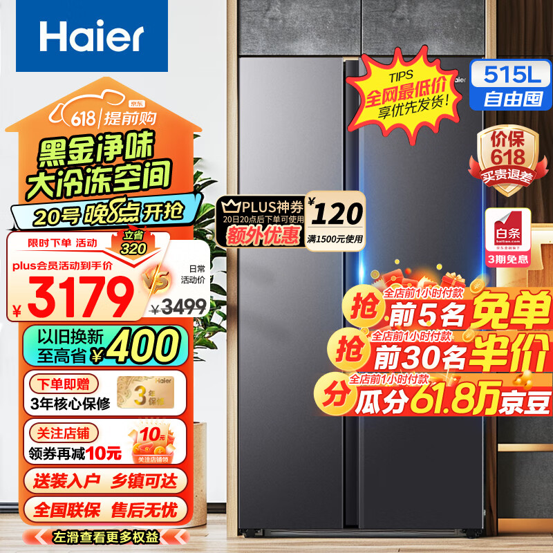 海尔(Haier)515升超大冷冻空间冰箱 双开门大容量 一级能效 变频风冷无霜对开门冰箱 黑金净化 超薄 以旧换新价格:3499.00元!