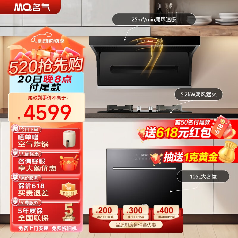名气(MQ)老板抽油烟机7字型家用顶侧双吸变频油烟机家用25吸力燃气灶洗碗机烟灶洗三件A5508+6510BT+091W价格:4599.00元!