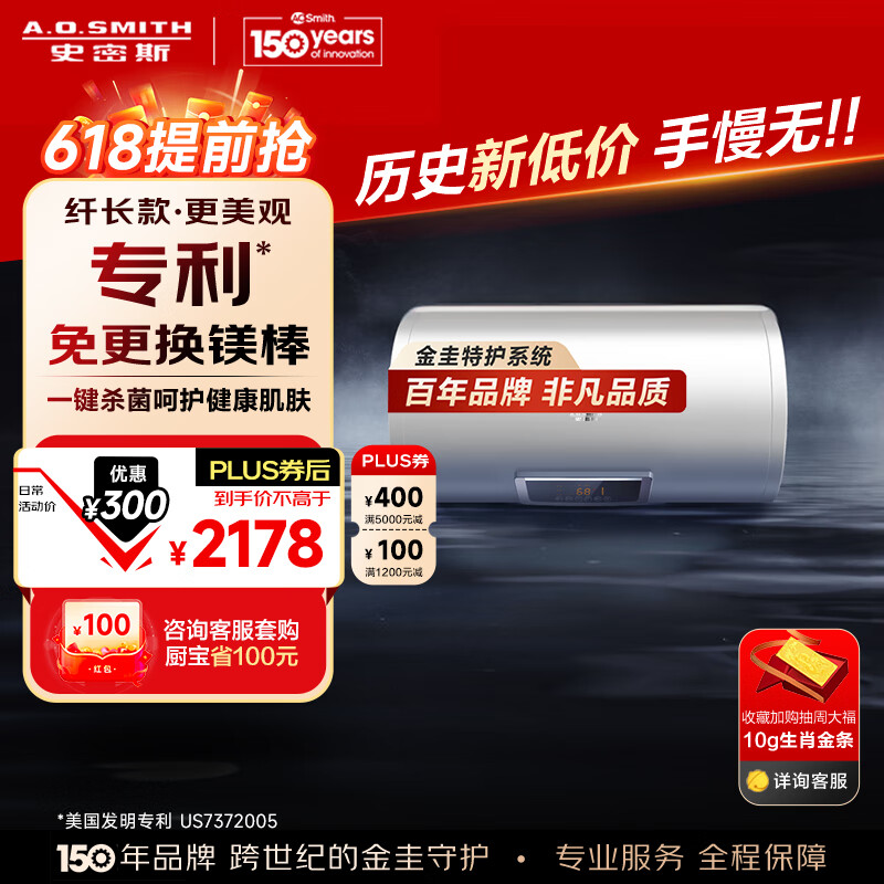 史密斯(A.O.SMITH)60升电热水器 专利免更换镁棒 金圭内胆 速热节能 纤美长款 大屏E60VC0 一级能效价格:2478.00元!