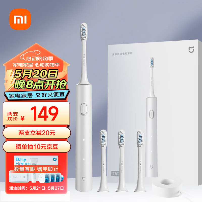 米家 小米电动牙刷T302成人/学生 4种净齿模式 150天续航 4支刷头 银灰色 礼物推荐价格:159.00元!