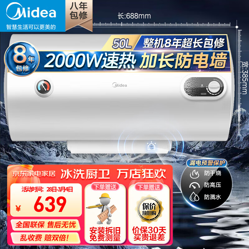 美的(Midea)储水式电热水器家用洗澡高效速热出租屋节能省电健康洗浴小型储水式防漏电A3 50升2-3人洗【2000W速热防电墙】价格:639.00元!
