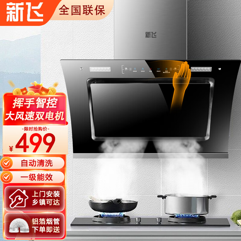 新飞油烟机侧吸式家用900宽抽油烟机19立方双电机大吸力排烟机五健触摸体感自动清洗厨房橱柜CXW-280-B价格:499.00元!