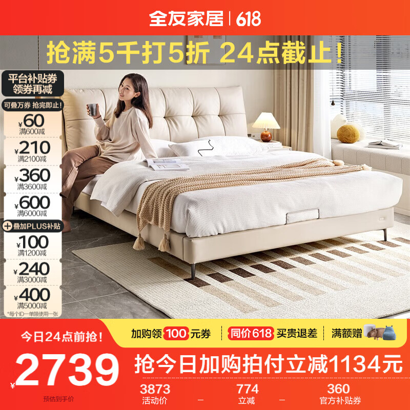 全友家居 奶油风真皮云朵床1.8x2米主卧室家具软包高脚双人大床116026价格:3873.75元!