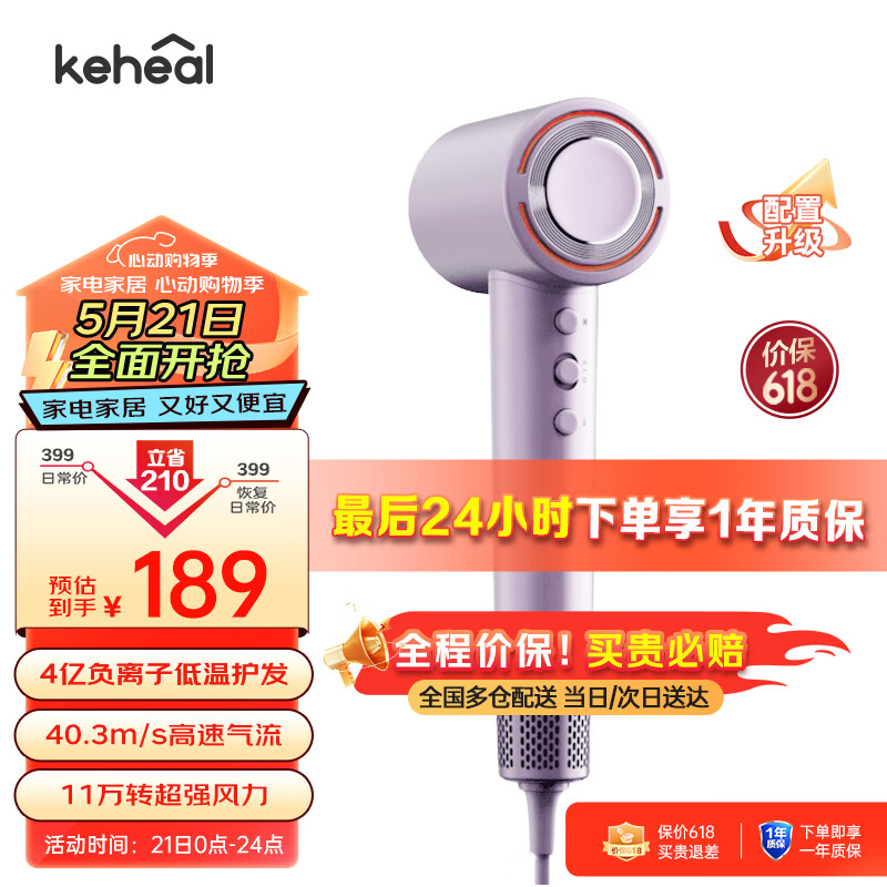 KEHEAL科西高速电吹风机 家用大风力大功率速干负离子护发不伤发低噪便携吹风筒送女友生日礼物 VE香芋紫价格:205.00元!