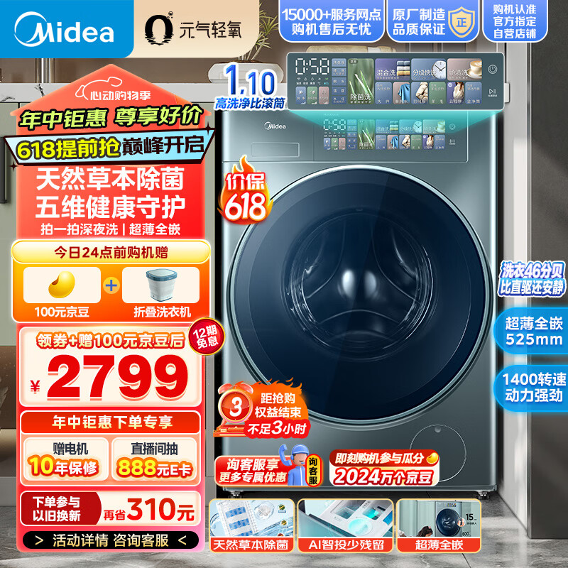 美的(Midea)滚筒洗衣机全自动 AIR5 元气轻氧系列 MG100SAIR 天然草本除菌 超薄全嵌 1.1洗净比 智能投放价格:2999.00元!