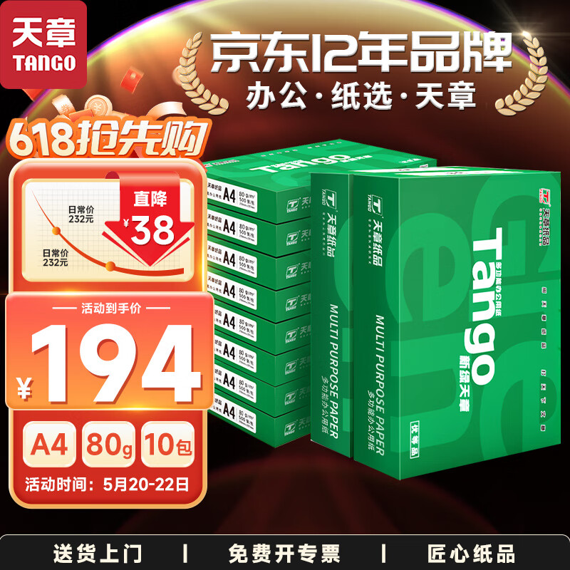 天章 (TANGO)新绿天章A4打印纸 80g 500张*10包 双面打印复印纸 洁白顺滑不卡纸 整箱5000张【匠心品质款】价格:194.00元!
