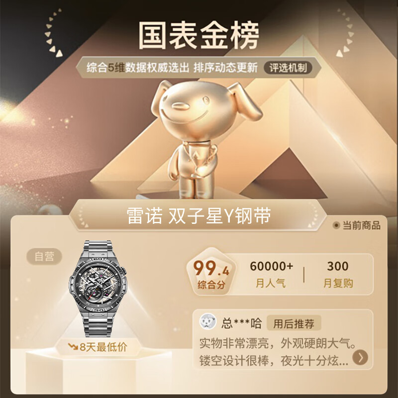 雷诺(RARONE)手表双子星Y国表男士机械手表镂空机械表钢带送男友520情人节礼物价格:2579.00元!