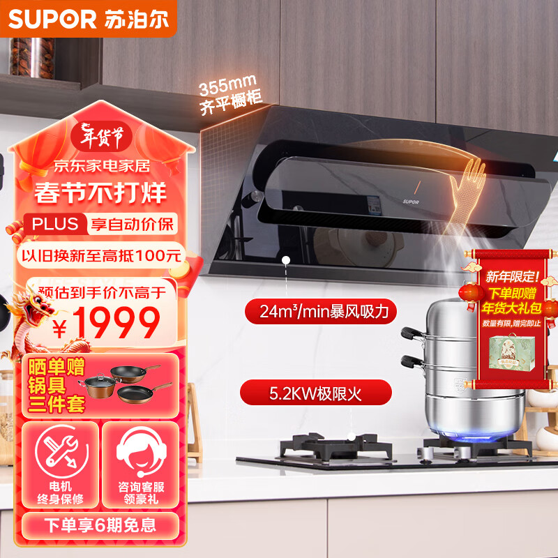 苏泊尔(SUPOR)抽油烟机 24m3/min大吸力 变频侧吸式脱排抽吸油烟机家用 挥手智控免拆洗烟灶套装 DJ50S+DB28天价格:1999.00元!