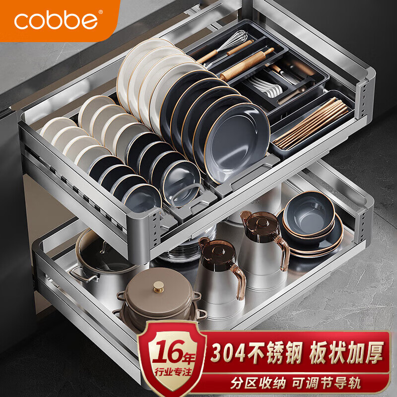 卡贝(cobbe)厨房拉篮橱柜抽屉式碗篮碗架304不锈钢碗碟篮加深加高拉蓝价格:808.00元!