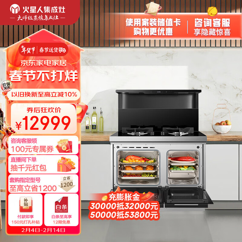 火星人ET30BCZ 集成灶蒸烤一体 左蒸烤炸右快蒸 家用蒸箱烤箱 燃气灶液化气价格:13099.00元!