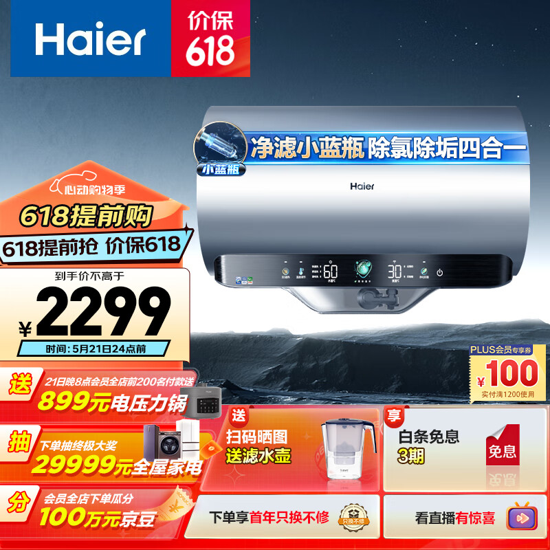海尔(Haier)60升【3D小蓝瓶】瓷净瞬热美肤净水洗电热水器 家用储水式3300W速热大水量一级能效 EC6005-JE7KU1价格:2499.00元!