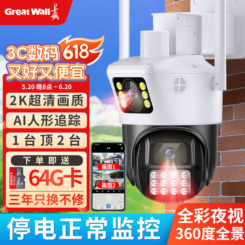 长城家用摄像头手机远程监控器360度无死角带夜视全景无线室外高清可对话农村户外防水旋转球机价格:186.00元!
