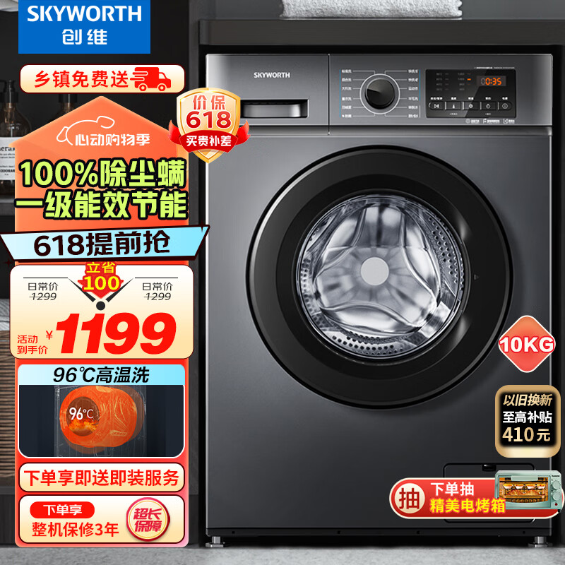 创维(SKYWORTH)10公斤大容量变频滚筒洗衣机全自动 整机3年 除尘除螨15分快洗桶自洁XQG100-B15LB价格:1199.00元!