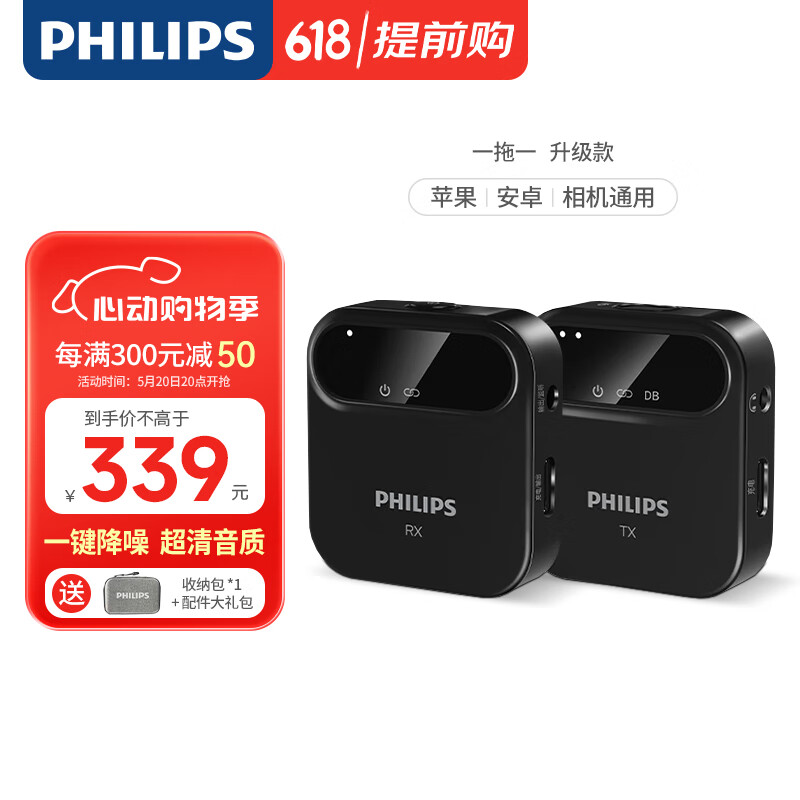 飞利浦(PHILIPS)无线领夹麦克风一拖一小蜜蜂收音器直播设备Vlog短视频采访话筒手机相机IOS安卓通用DLM3538C价格:389.00元!