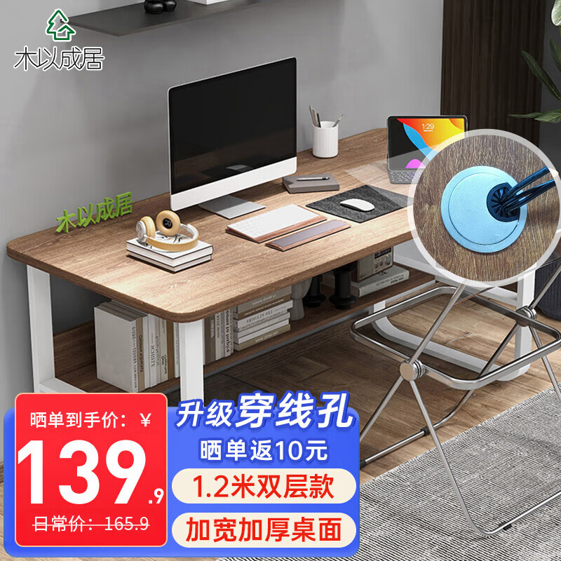 木以成居电脑桌台式加宽书桌学习桌穿线孔简约书架组合写字桌子橡木色价格:139.00元!