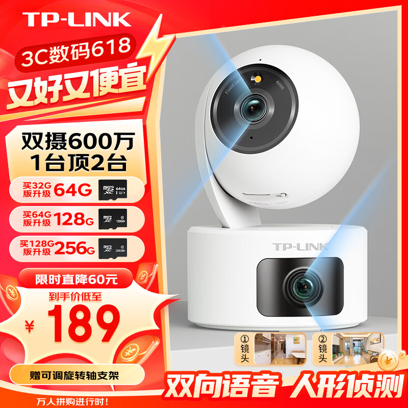 TP-link双摄600万监控摄像头家用监控器360度无死角带夜视全景无线家庭室内tplink远程婴儿看护宝宝监护价格:189.00元!